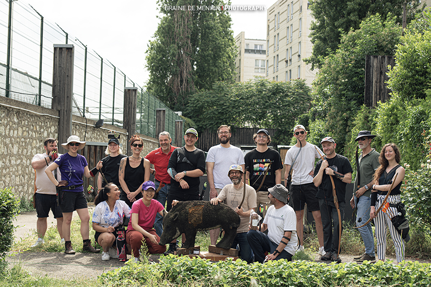 Notre sanglier juché sur ses roulettes n'aura pas évité les tirs des trois pelotons réunis : quelques manqués, bris de flèches, au gré de l'humeur farceuse des archers chargés de tracter l'animal, mais également de beaux impacts et surtout une très belle ambiance pour ce tir ludique.
